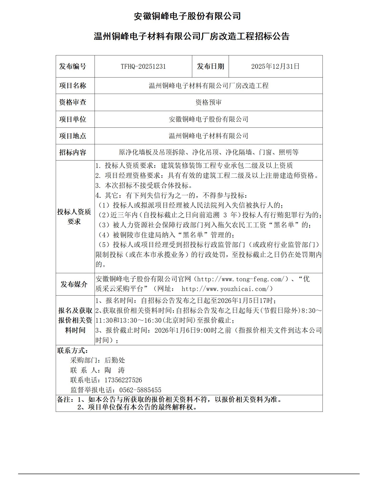 01-安徽銅峰電子股份有限公司 (溫州銅峰電子材料有限公司廠房改造工程 招標(biāo)公告)_01